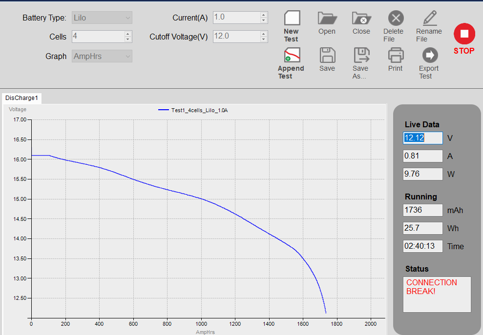 Zmierzona rzeczywista pojemność: 1736 mAh - tylko tyle aż akumulator został rozładowany do tzw. "odcięcia"